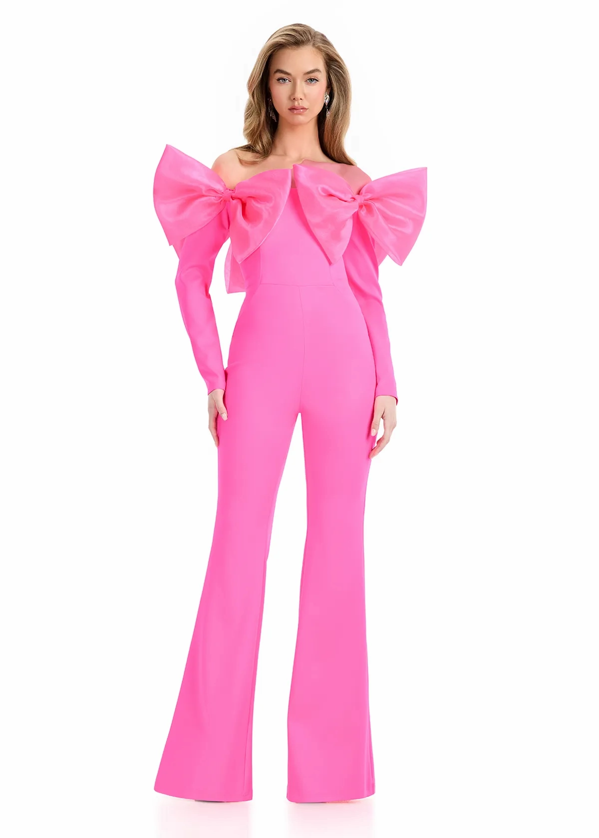 Turn heads in this statement jumpsuit. ASHLEYlauren Style 12090 is designed for bold and confident fashion lovers. Featuring an off-the-shoulder neckline with oversized bow details, long sleeves, and a flattering fitted silhouette that flares at the legs, this chic piece combines elegance with playful glamour.
